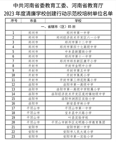 根据《关于印发<清廉学校创建行动示范校培树实施办法>的 通知》(豫教工委(2023)175 号),省委教育工委、省教育厅开 展了 2023年度清廉学校创建行动示范校培树单位认定工作。经单 位申报、初步审核、专家评审、实地查验评估和公示等程序,认 定郑州大学、郑州市第一中学等 108 所学校作为省委教育工委、 省教育厅 2023 年度清廉学校创建行动示范校培树单位,现将名单予以公布(见附件)。
